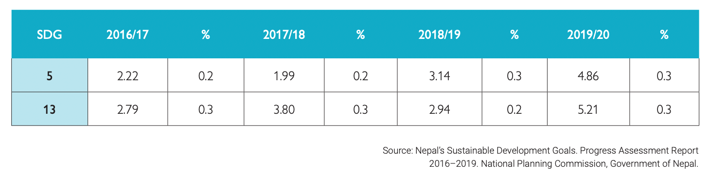 The gender-climate nexus has been much discussed in the context of Nepal’s pre-existing social and economic inequalities. Policies like have attempted to integrate the gender equality and social inclusion (GESI)[85] when factoring in development concepts and budget allocation as the table below shows the budget allocation for climate action and gender equality, in NPR billion,[86]