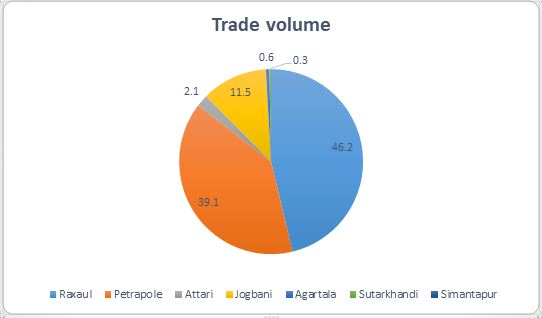 Total trade through the land port is INR 39,394.46 Cr. Nepal and Bangladesh are the top trade partners of India with a percentage share of 47% and 42% respectively.