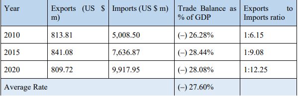 Nepal’s economy is hampered by the external sector (imbalanced trade). Table 3 depicts that trade balance to GDP has remained negative with an average of 27.60 percent in 2010, 2015, and 2020. The exports to imports ratio increased from 1:6.15 in 2010 to 1:12.25 in 2020. These epitomize the country's weak trade performance.