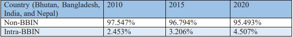 Table 6 offers a comparative trend of total intra-BBIN trade; highest at the level of 4.507 percent in 2020. In the preceding years 2010 and 2015, it stood at 2.453 and 3.206 percent respectively in the total intra-sub-regional trade. It is striking that almost 95 percent of it is traded with non-BBIN partners. Hence, ample interventions are required for changing this trend.